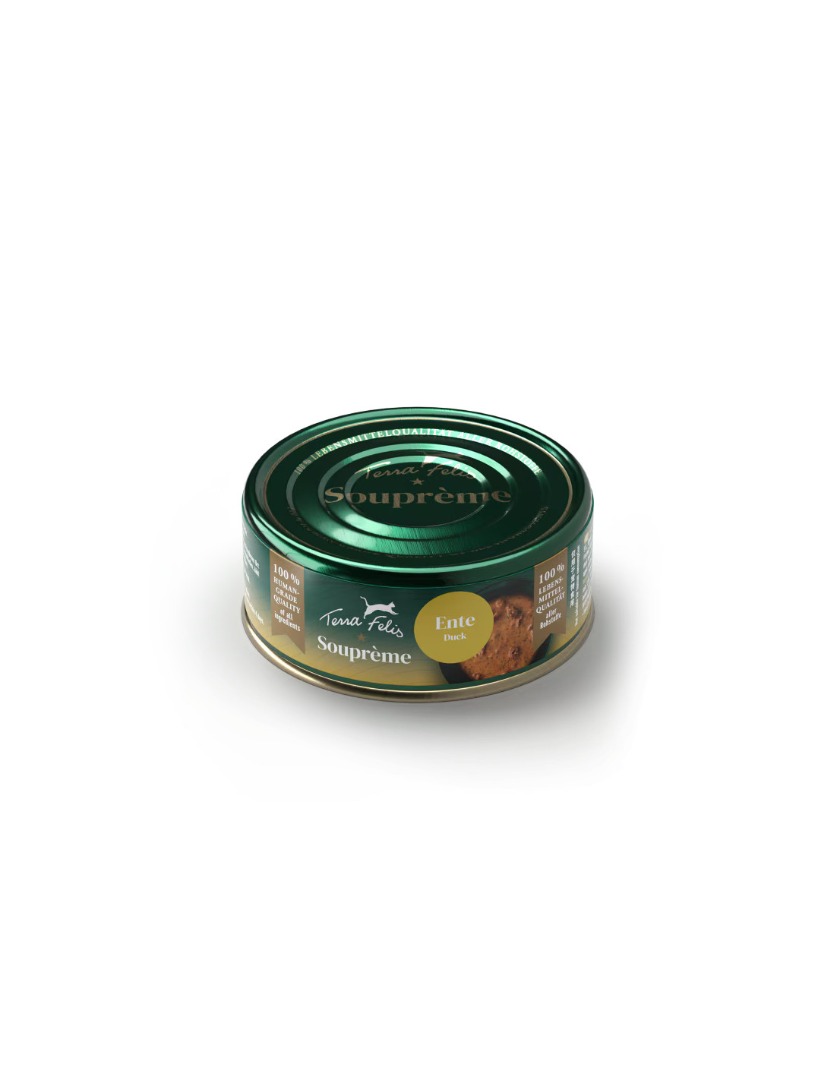 Podaruj swojemu kotu wyjątkową ucztę inspirowaną naturą. Terra Felis Souprème Duck to lekka, kremowa zupa przygotowana wyłącznie ze składników jakości spożywczej (human grade). Receptura, stworzona przez weterynarzy, powstaje w naszym zakładzie produkcyjnym na bawarskiej wsi, gdzie rygorystyczne kontrole jakości gwarantują najwyższy standard i pełną świeżość.